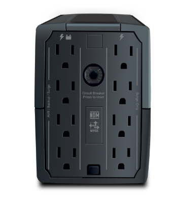 Interactivo de línea de 1000 VA con 8 tomacorrientes NEMA 5-15, diseñado para el hogar y la oficina. Baterías internas selladas de plomo-ácido, regulador de voltaje, supresor de sobretensiones y tomacorrientes de derivación para cargas mayores. Proporciona alimentación continua a routers wifi, sistemas de alarma y equipos informáticos. Las alarmas audibles indican el funcionamiento y el nivel de batería. Certificado por las agencias reguladoras NOM, ISO9001-2015, ISO14001 y RETIE.